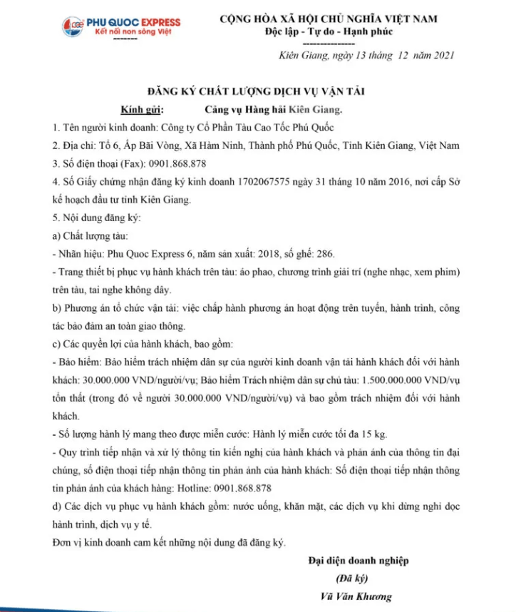 Đăng ký chất lượng dịch vụ tàu Phú Quốc Express 6