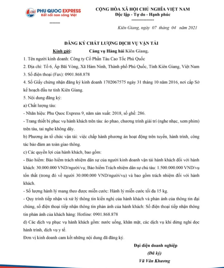 Dưới đây là thông tin đăng ký chất lượng dịch vụ tàu Phú Quốc Express (đội tàu Đỏ):