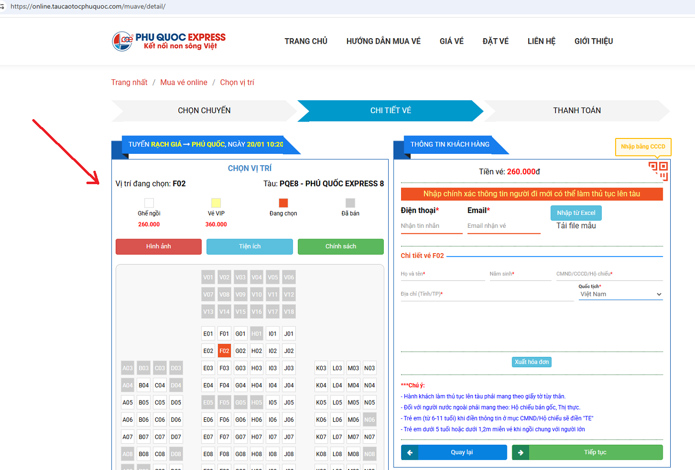 Hành khách click vị trí ghế mong muốn và tiếp tục thực hiện các bước đặt vé tàu đi Phú Quốc.