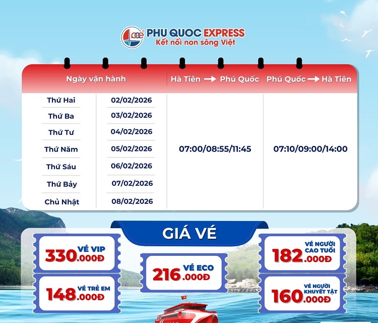 Tháng 2 là mùa cao điểm đẹp nhất của Phú Quốc với khí hậu khô, nắng nhiều và biển lặng phù hợp cho du lịch biển và di chuyển bằng tàu cao tốc. Đây là thời điểm cận Tết Âm lịch lượng hành khách có nhu cầu đi lại đông đúc, vì vậy nên đặt vé tàu sớm để chọn vị trí ghế và giờ tàu mong muốn.