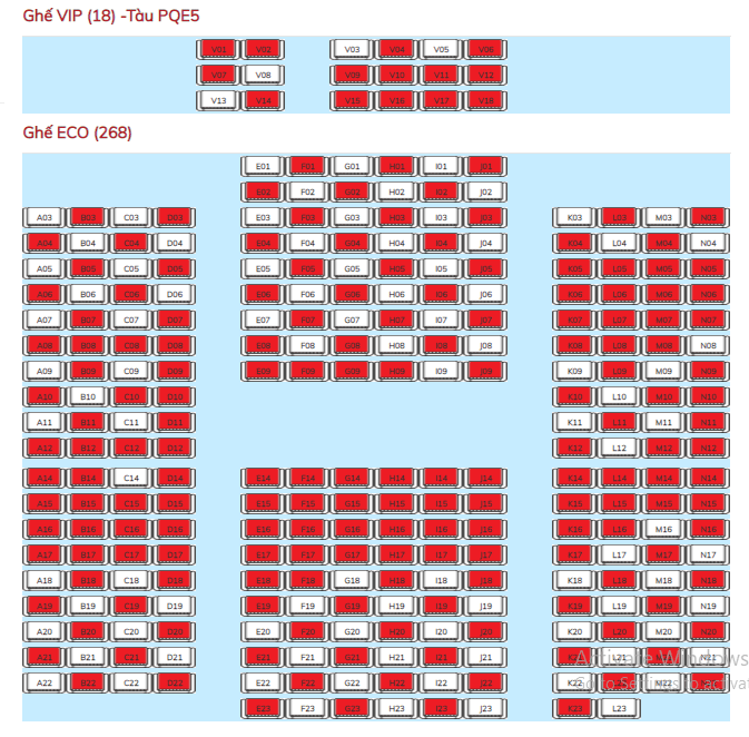 Chọn ghế: Hành khách lựa chọn vị trí ghế ngồi trên tàu Phú Quốc Express 05 theo sơ đồ hiển thị trên hệ thống mua vé trực tuyến. Lưu ý chỉ chọn ghế hiển thị màu trắng (còn vé), vé màu xám (vé đã bán).