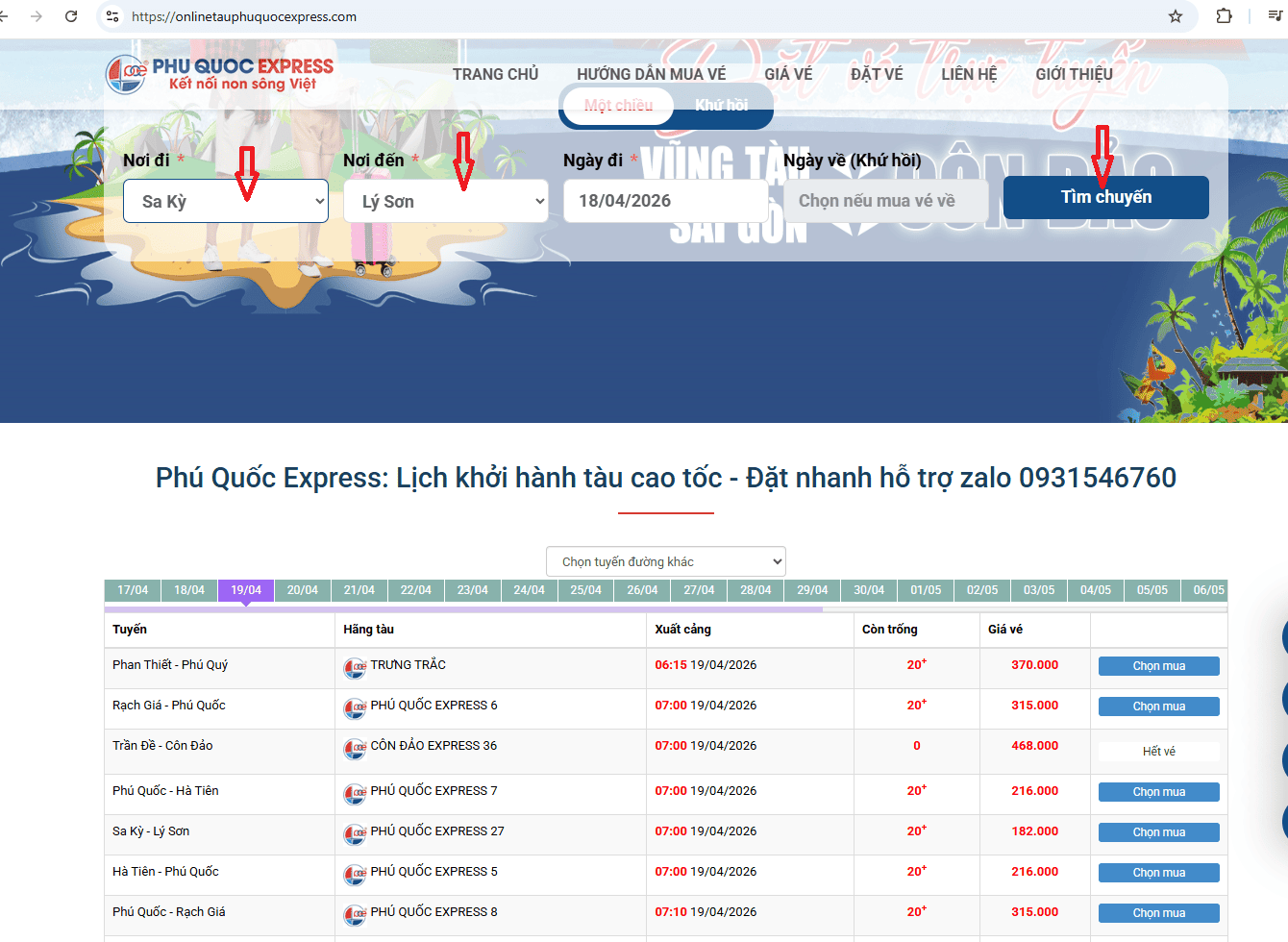 Vé tàu Phú Quốc Express 5 Sa Kỳ - Lý Sơn chi tiết các hạng vé và hướng dẫn chi tiết từng bước mua vé tàu cao tốc Sa Kỳ online: chọn ghế, thanh toán trực tuyến và nhận vé điện tử (không cần xếp hàng tại bến). Zalo hỗ trợ đặt vé: 0931546760.