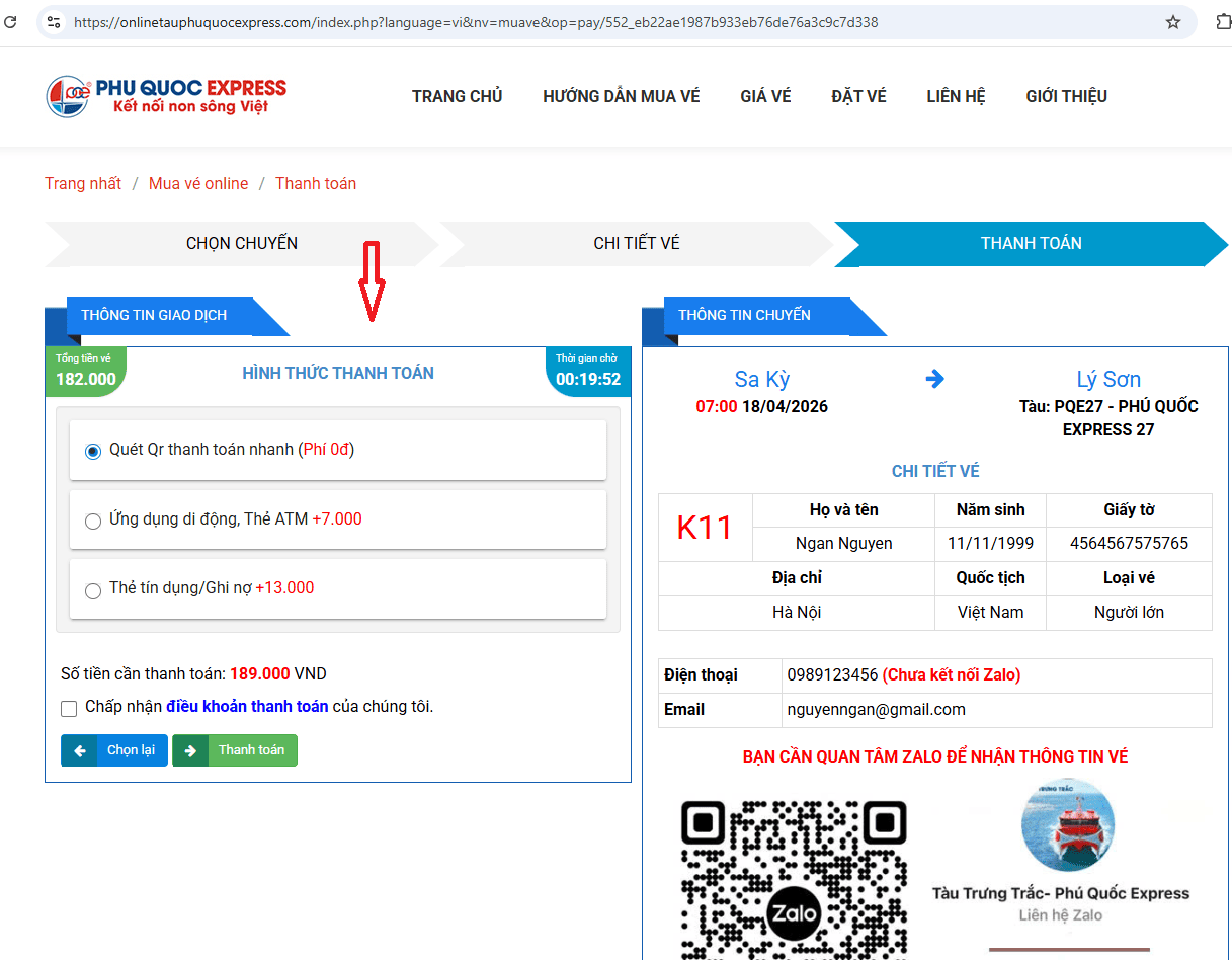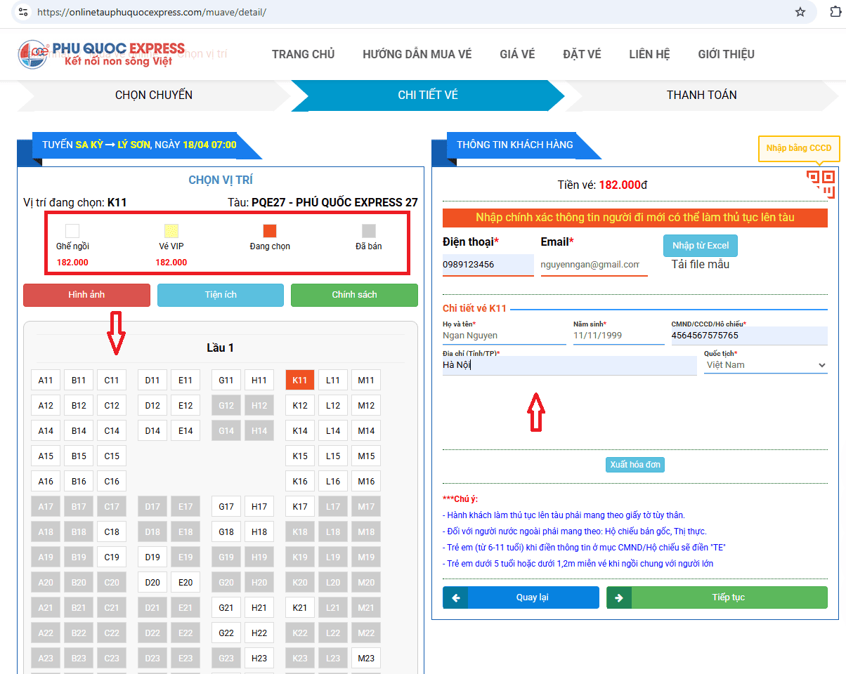 Điền thông tin: Đây là bước quan trọng để làm thủ tục với Cảng vụ và Biên phòng, vì vậy hành khách cần đầy đủ và chính xác. Thông tin gồm: Họ tên, số CCCD/hộ chiếu, đối với trẻ em chưa có CCCD cần nhập đúng ngày tháng năm sinh. Sau đó điền số điện thoại và Email để nhận thông báo xác nhận vé.