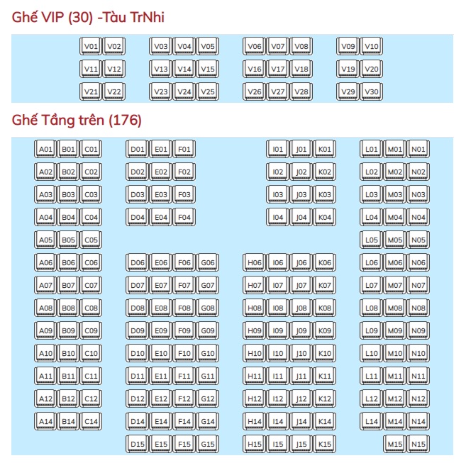 - Chọn vị trí ngồi trên tàu theo 2 hạng ghế: VIP hoặc phổ thông. Ghế màu trắng (còn trống) và màu xám (đã mua).